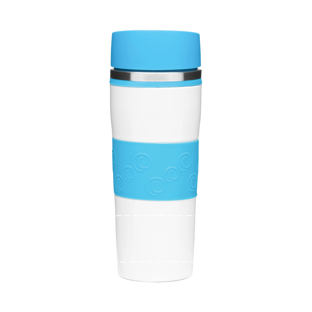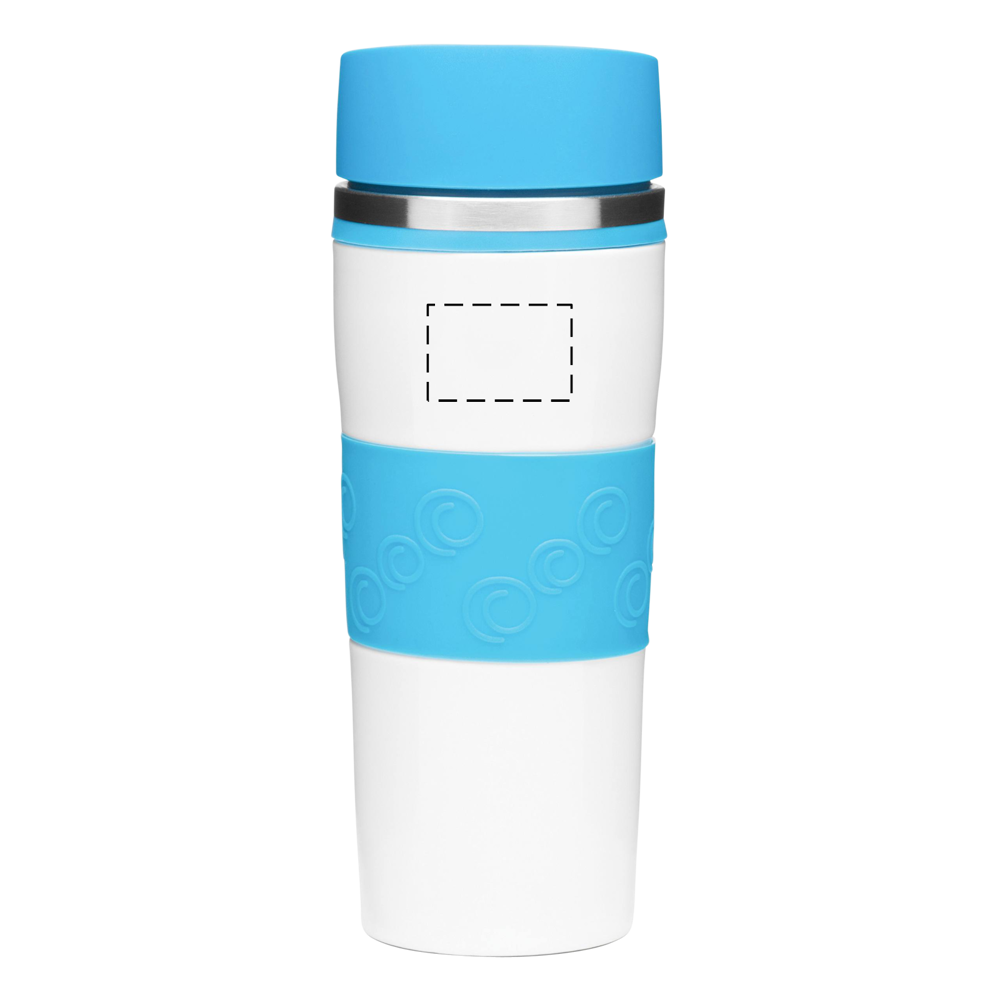 Dubbelwandige isoleerbeker ARABICA van roestvrijstaal met gekleurde rubbergrip. Gekleurd kunststof schroefdeksel met drukknopje om de geïntegreerde drinkopening te openen en sluiten. Onderkant voorzien van rubbervlak voor een betere stabiliteit. Inhoud ca. 400ml.