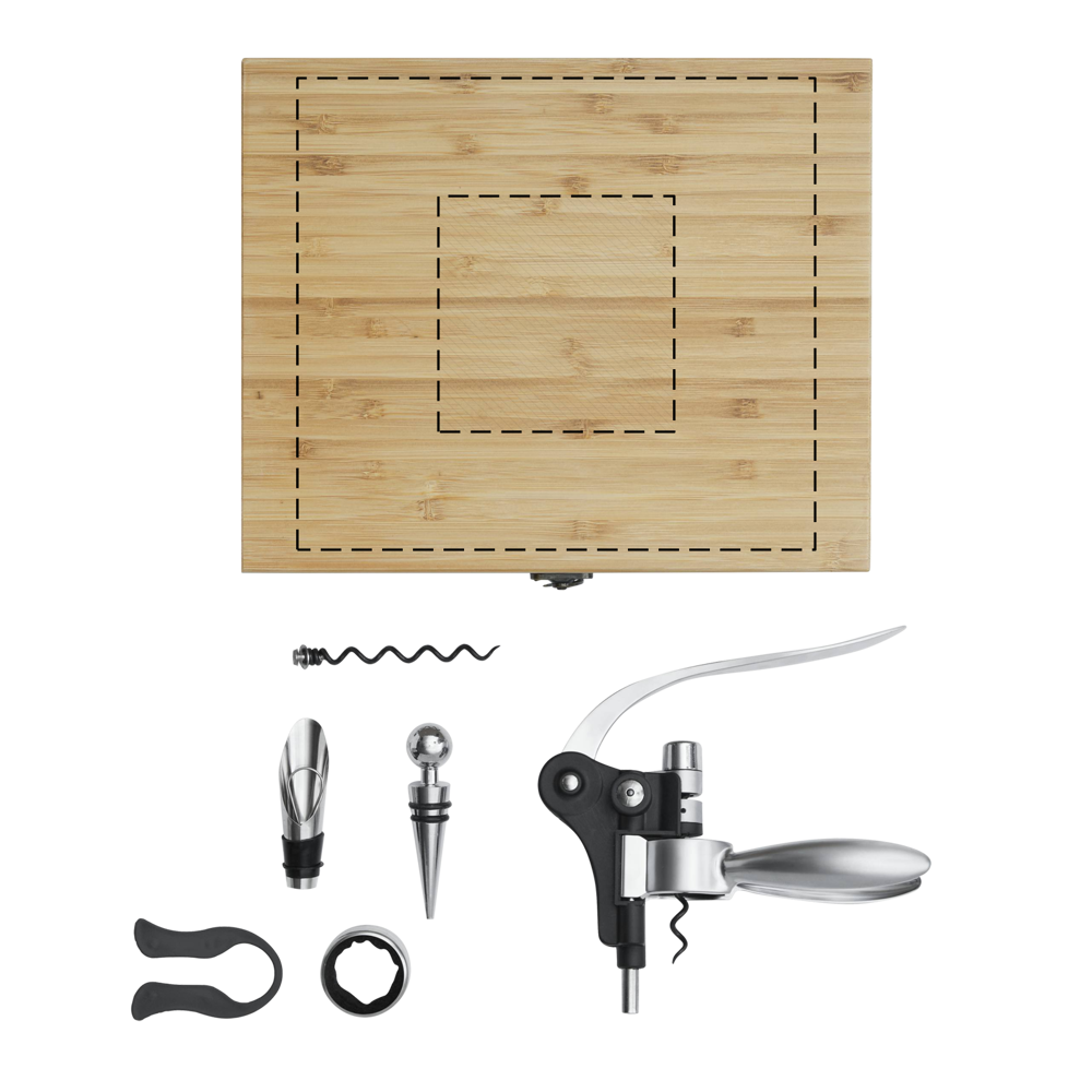 Wijnset NOBLE WINE Sommelierset in bamboe kist, met:kurkentrekker met hefboom, reserve carbon spil, RVS druppelring, metalen flesstopper, schenktuit en foliemes.