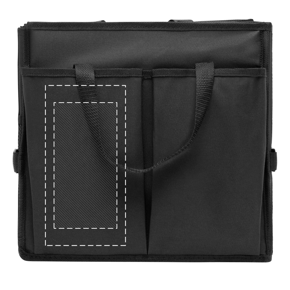 Kofferbaktas SUPER GADGET: opvouwbaar design, uitgevoerd uit 2 tassen die door klittenband met elkaar verbonden kunnen worden, 1 tas is voorzien van een deksel met handvat en 1 grote tas met 3 flexibele tussenschotten, handvatten, aan de zijkant 2 insteekvakken met aan de voorkant gaasvakken, versterkte bodemplaten, 2 gespen en talrijke clips. Klittenband op de bodem voor bevestiging in de kofferbak.